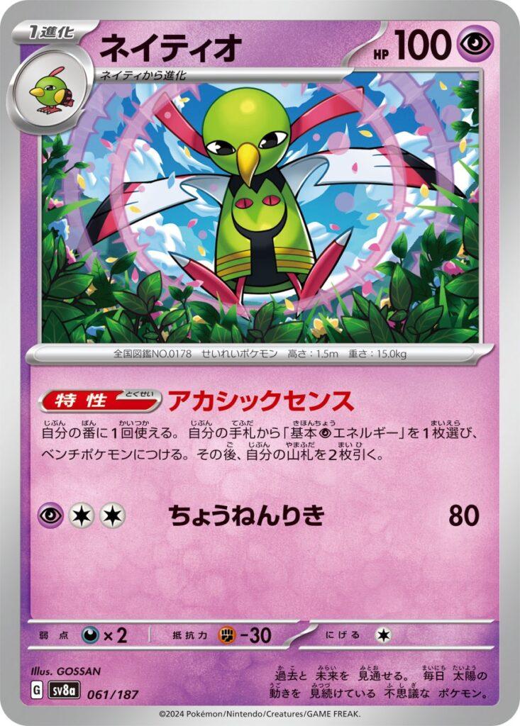 - なぜ代用になるのか: ネイティオのように特性を介さず、グッズ1枚でトラッシュからエネ加速できるのが最大の特徴です。進化の手間が省ける分、デッキの枠を攻撃的なパーツに割けるようになります。